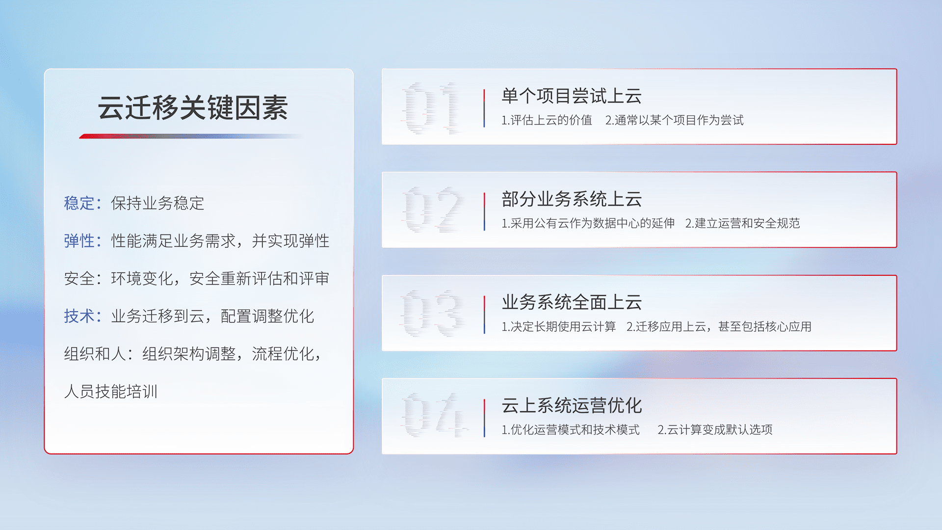 结合实际业务,,,从规划设计、、、、云平台选型、、、云原生改造、、、、数据迁移、、、、集成交付,,,迁移全过程为客户识别最佳上云路径,,,,做好风险识别管理,,,,设计网络架构、、、身份权限、、安全审计合规、、操作审计、、、、日志审计、、、监控告警策略、、、多站点容灾设计等,,对云上基础设施进行整体规划,,,提升IT治理水平,,以满足弹性、、高可用、、、、高性能的需求。。。