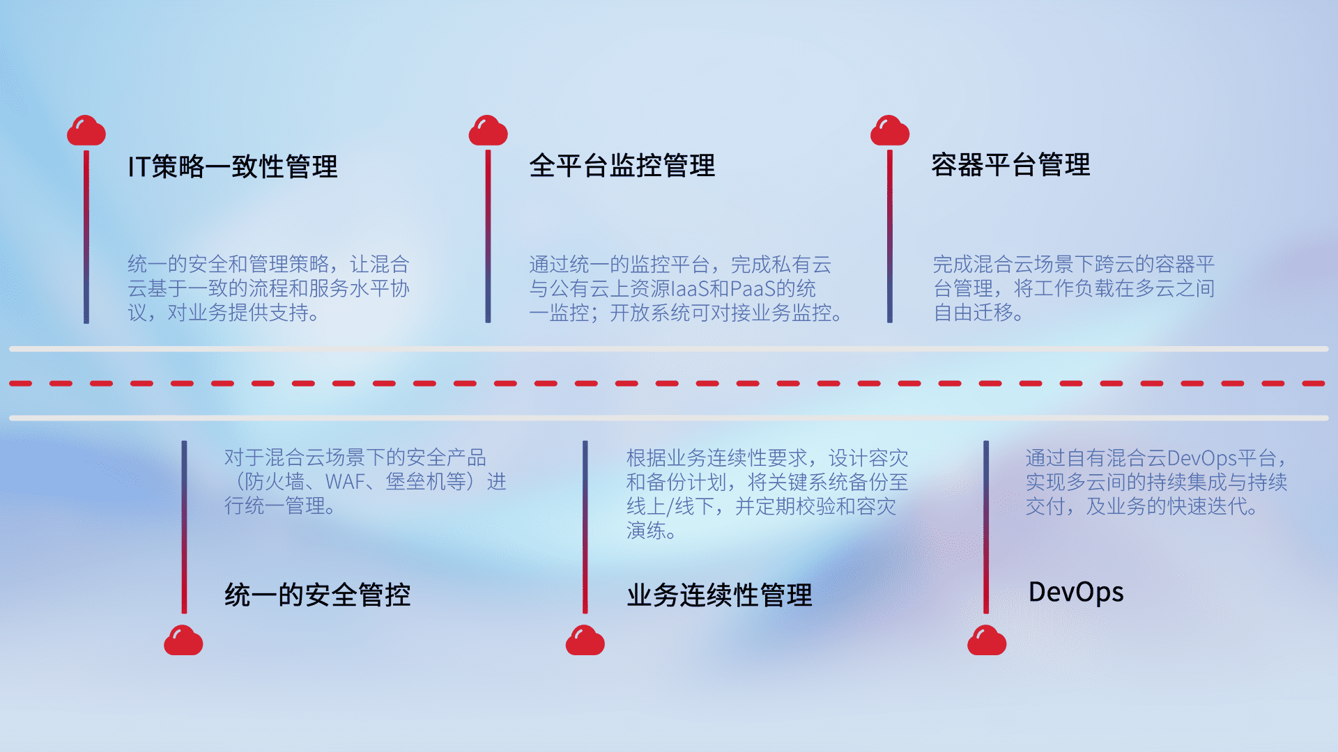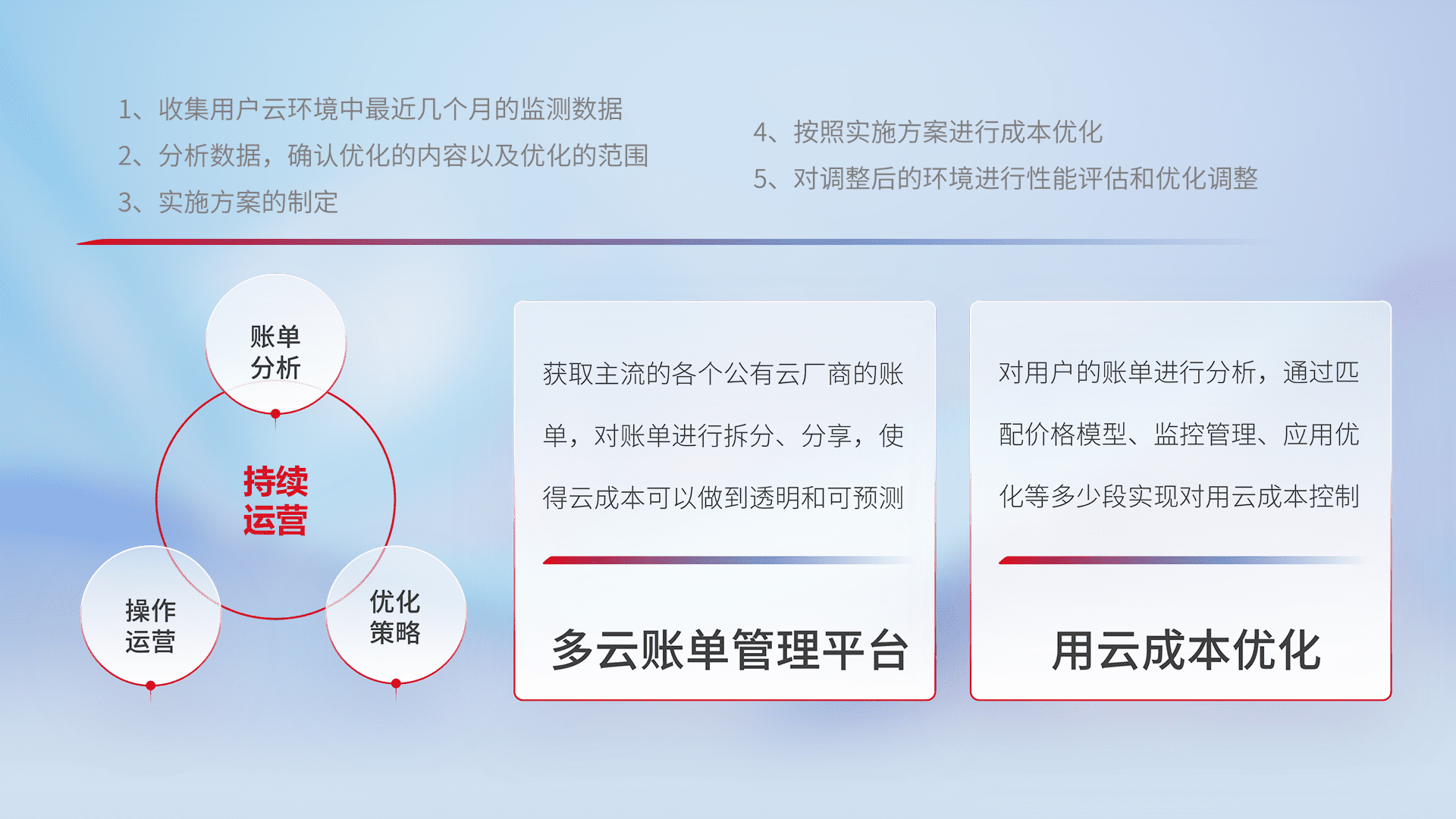 通过多云纳管,,,,以统一的资源数据模型把客户的云资源进行抽象和封装,,,进而实现对多云资源的统一操作,,,保障云资源管理的可靠性、、稳定性与可用性。。。。量身定制化运维内容,,,,配置、、、开发运维、、、补丁管理、、、备份、、、、监控、、认证和访问管理、、审计和日常巡检等,,保障在用云过程中的可靠度,,,,稳定度以及高可用率。。。